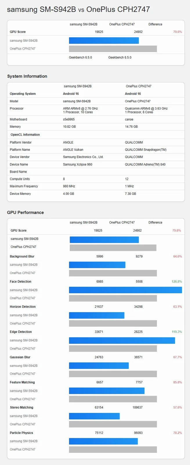 Es handelt sich in diesem Fall nicht um den CPU-Benchmark sondern einen Vulcan and OpenCL GPU-Test, der in den frühen Testmodellen offenbar bereits recht nahe an den Ergebnissen des Snapdragon 8 Elite Gen 5 liegt, etwa im OnePlus 15 (hier bei Amazon erhältlich). Ganz fair ist der Vergleich natürlich noch nicht, da Samsungs Galaxy S26 in den nächsten Wochen durch Software-Optimierungen vermutlich noch etwas bei der Performance zulegen kann, schon jetzt erreicht die Xclipse 960 GPU allerdings etwa 88 Prozent der Adreno 840 GPU-Performance in Vulkan und knapp 80 Prozent im OpenCL-Test.