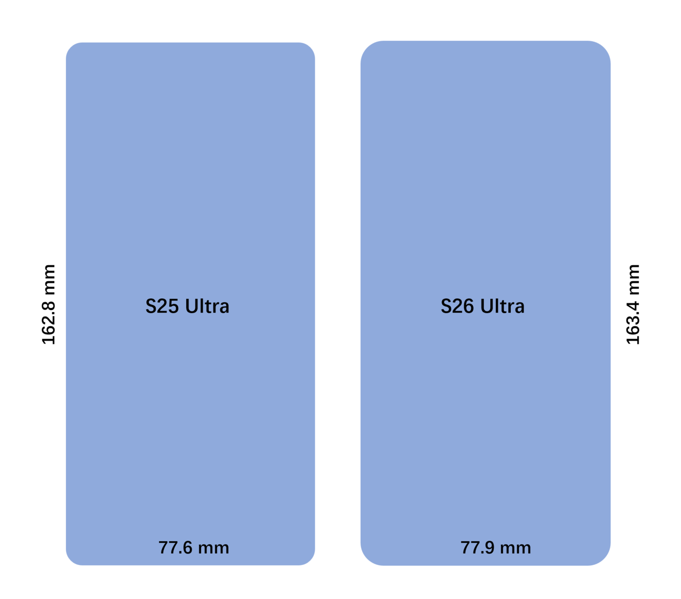 Die Bilder unten demonstrieren die erwarteten Unterschiede beim Frontdesign des Galaxy S26 Ultra im Vergleich zum Vorgänger. Demnach wird das AMOLED-Panel des nächsten Samsung-Flaggschiffs minimal höher und breiter. Statt 162,8 mm also 163,4 mm und 77,9 mm statt 77,6 mm in der Breite. Wie bereits vom Leaker vor Tagen angekündigt, ändert sich auch das Design der Display-Ecken weiter. Das Galaxy S26 Ultra wird also deutlich rundlicher als das Galaxy S25 Ultra aktuell.