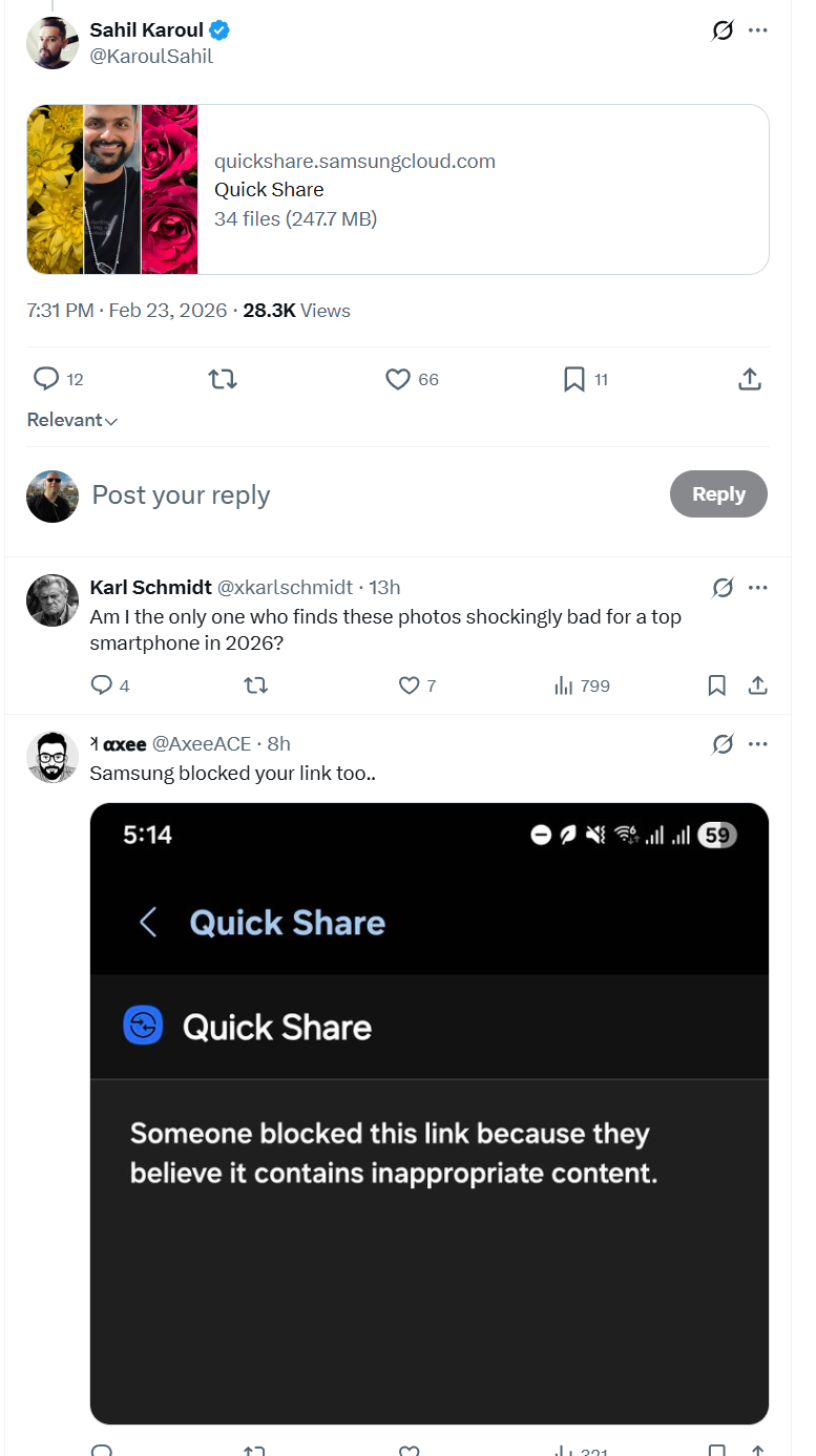 Übrigens würden wir euch gerne die volle Auflösung und alle Sample-Fotos des Testers zur Verfügung stellen, allerdings blockiert Samsung den Cloud-Zugang von Sahil Karout, offenbar weil ihnen der Inhalt nicht gefällt. Das wirft einen weiteren düsteren Schatten auf die berühmt-berüchtigte Rechtsvertretung der Südkoreaner, die sogar nicht davor zurückschrecken, Videos des Testers auf X mit einem Copyright-Strike zu belegen, obwohl sie nach üblicher Rechtsmeinung kein Copyright an den rechtmäßig erstellten Inhalten des Creators haben.