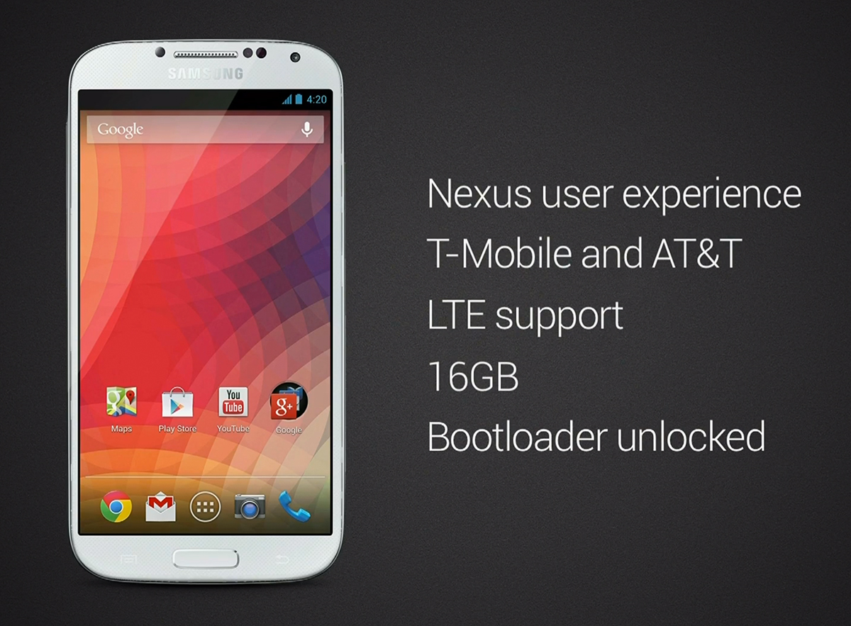 Neue Geräte hat Google im Rahmen der Keynote auf der Entwicklerkonferenz I/O in San Francisco nicht präsentiert. Nach diversen Gerüchten im Internet wurde aber zumindest ein Ableger des Samsung Galaxy S4 angekündigt. Die von Hugo Barra (VP Product Management Android) vorgestellte Google Edition unterscheidet sich vor allem durch die verwendete Software. Die Tüftler aus Mountain View liefern das High-End-Smartphone mit einem nackten Stock-Android und entsperrtem Bootloader aus. Diese Android-Version mit Vanilla-UI ist unverändert und kommt unter anderem bei den Geräten der Nexus-Serie zum Einsatz.