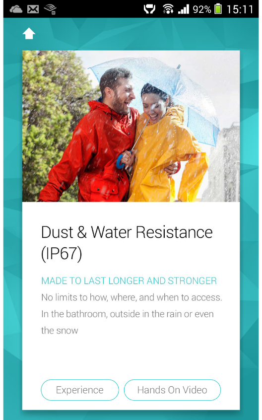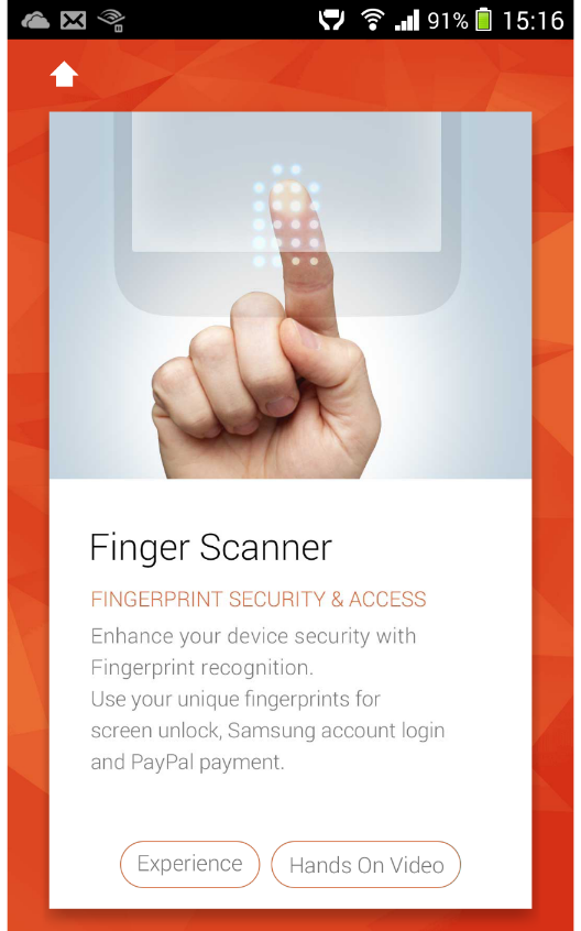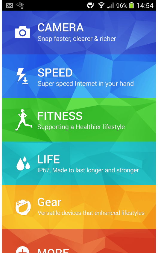„Speed“ demonstriert die besonders schnellen Downloadzeiten des Galaxy S5 mit dessen zwei Antennen sowie der Möglichkeit, Wi-Fi und LTE zeitgleich zu benutzen. Im Fitness-Bereich kann man sich den „Pedometer“ ansehen, der die eigenen Schritte beim Joggen zählt. Mit „Exercise“ erstellt man einen Trainingsplan und der „Heart Rate Monitor“ misst den Puls. „Life“ bewirbt die IP67-Zertifizierung, die das Gerät staub- und wasserabweisend macht. „Gear“ schließlich erlaubt einen Ausblick auf das „Gear Fit“ genannte Fitnessarmband und die Smartwatch „Gear 2“. Den Fingerabdruckscanner hat Samsung im „Zusätzliche Features“-Bereich versteckt. Er durfte einige kritische Kommentare im Vergleich zum Scanner des iPhone 5s einstecken. Der Fingerabdruckscanner des Galaxy S5 erfordert eine Wischgeste und man kann nicht einfach den Home-Button berühren wie beim iPhone. Zumindest in der Werbe-App fällt das dennoch nicht schwer.