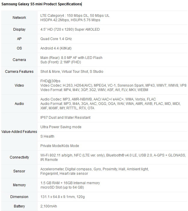 Gemäß Samsung kommt das 120 Gramm schwere LTE-Smartphone Galaxy S5 mini (S4 mini: 107 g) noch im Juli in Russland in den Farboptionen Blau (Electric Blue), Gold (Copper Gold), Schwarz (Charcoal Black) und Weiß (Shimmery White) in den Handel. Das Galaxy S5 mini ist neben einem Quadcore-Prozessor (1,4 GHz) und Android 4.4 KitKat auch mit dem Fingerabdruckscanner sowie dem Pulsmesser des großen Bruders Galaxy S5 ausgestattet. Zudem ist auch das S5 mini wie das große S5 wasser- und staubdicht nach IP67.