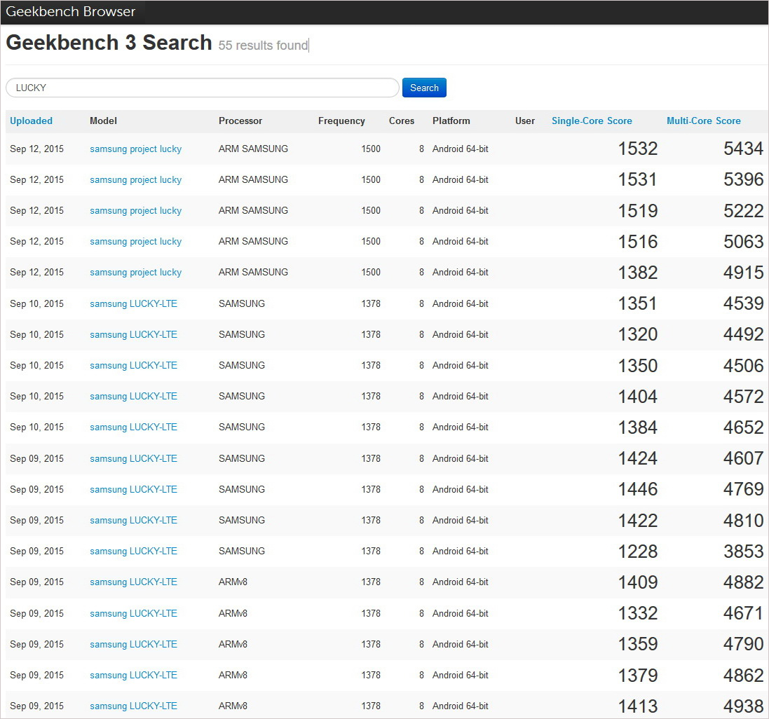 Project Lucky: Mehr als 50 Datenbankeinträge findet dazu die Geekbench-3-Suche. Wie wir wissen, arbeitet Samsung längst an den Flaggschiff-Smartphones der kommenden Generation und Serie Galaxy S7. Ende Juni gab es bereits Gerüchte, dass Samsung mit den Galaxy-S7-Baureihen Ende 2015 respektive Anfang 2016 schon die Nachfolger von Galaxy S6, Galaxy S6 edge und Galaxy S6 edge+ ankündigen wird.