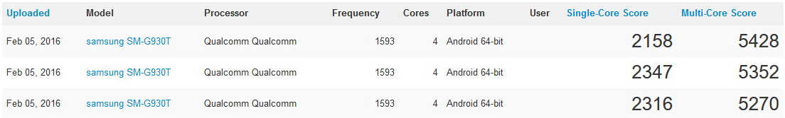 Aktuell wurde das Samsung Galaxy S7 mit dem Kürzel SM-G930T gebencht, das sehr wahrscheinlich für den Mobilfunkanbieter T-Mobile bestimmt ist. Die Scores für den Single-Core-Test variierten demnach zwischen 2158 und 2347 Punkten. Die Multi-Core-Scores lagen zwischen 5270 und 5428 Punkten. Den bisher höchsten Multi-Core-Wert erzielte bisher das SM-G930W9 mit 5946 Punkten. In diesem Modell arbeitet ein Exynos 8890 von Samsung.