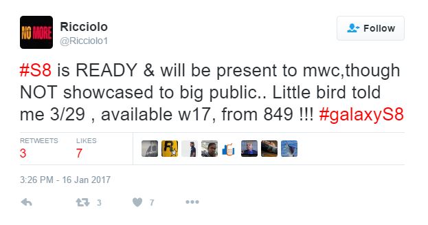 Ricciolo, bekannter Samsung-Leaker, will erfahren haben, dass Samsung das Galaxy S8 zwar zum Mobile World Congress Ende Februar mit im Gepäck haben, das fertig entwickelte Gerät aber nicht öffentlich ausstellen wird. Einige ausgewählte Journalisten dürften es dennoch zu sehen bekommen, wir werden also Ende Februar Zugriff auf erste offizielle Bilder des neuen Samsung-Flaggschiffs erhalten. Der offizielle Launch soll dann, wie bereits vermutet, im Rahmen eines Unpacked-Events stattfinden und zwar am 29. März, wenn man den Angaben des Leakers Glauben schenken will. Knapp einen Monat später in der 17. Kalenderwoche, das ist der 24. bis 30. April des Jahres, soll das Galaxy S8 dann verfügbar sein und zwar zu Preisen ab 849 US-Dollar für die Basisversion.