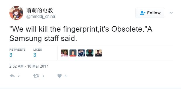 "We will kill the fingerprint, it's obsolete". Diese Worte soll ein Samsung-Mitarbeiter zum Twitter-User @mmddj_china geäußert (siehe unten) und damit mögliche Pläne von Samsung verraten haben, dem Fingerabdrucksensor langfristig den Garaus zu machen. Tatsächlich scheint die Entwicklung biometrischer Sensoren auf Smartphones langsam weg in Richtung Iris- oder Gesichtserkennung zu gehen, wobei der reine Iris-Scanner, wie er im gescheiterten Galaxy Note 7 zu sehen war, wohl nur ein Zwischenschritt auf dem Weg zur Gesichtserkennung war. Das Galaxy S8, welches vermutlich Ende April auf den Markt kommen wird, dürfte zwar Fingerabdruck- und Iris-Scanner anbieten, Samsung selbst scheint mit diesen Optionen alleine aber nicht mehr glücklich zu sein und will neuesten Gerüchten zufolge auch Gesichtserkennung ermöglichen, die mit einer Erkennungsleistung unter 0,01 Sekunden deutlich schneller arbeitet als Iris-Scanner oder Fingerabdrucksensor zusammen.