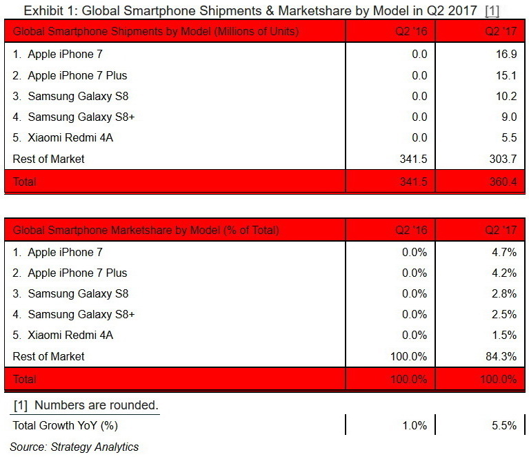Juha Winter, Senior Analyst bei Strategy Analytics schätzt, dass Apple vom iPhone 7 etwa 16,9 Millionen Einheiten in Q2/2017 ausgeliefert und sich damit einen globalen Marktanteil von 4,7 Prozent gesichert hat. Von seinem iPhone 7 Plus mit größerem Bildschirm und höheren Preise hat Apple dem Zahlenmaterial zufolge etwa 15,1 Millionen Einheiten abgesetzt.