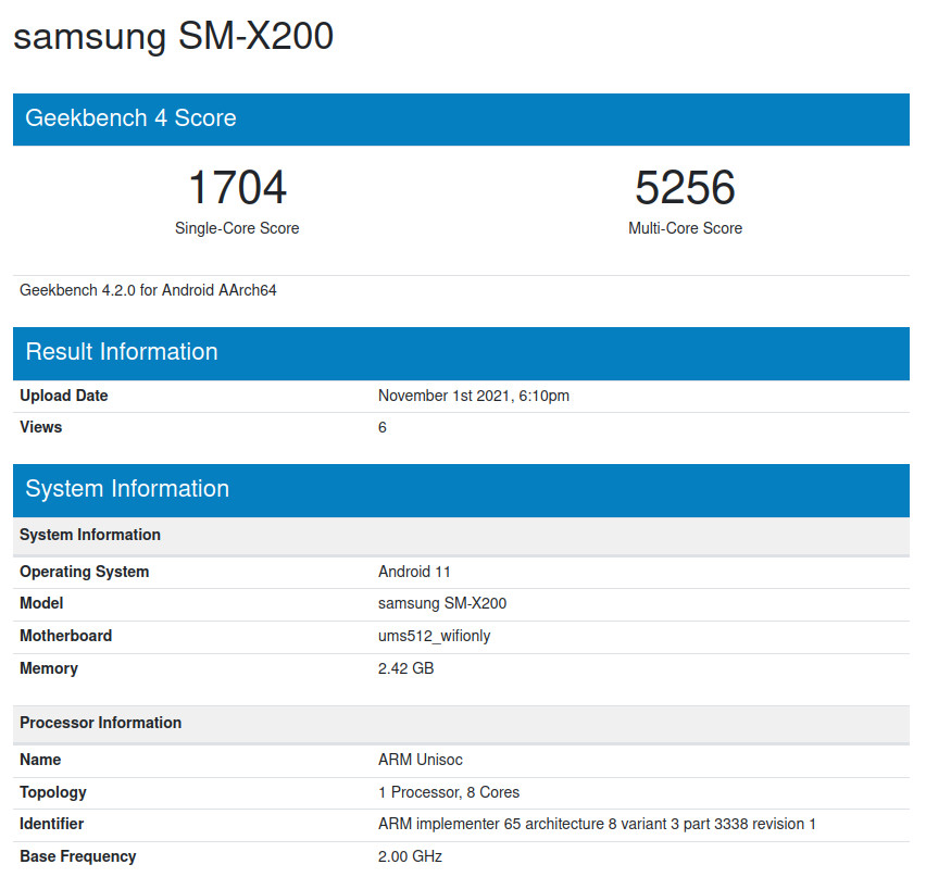 Die Verbesserung dürfte unter anderem mit der höheren Taktfrequenz der CPU zusammenhängen. Statt mit 1,8 GHz wie beim Galaxy Tab A7 erreicht der Prozessor 2,0 GHz. Dass der Unterschied nicht größer ausfällt, könnte am neuen Prozessor liegen. Statt eines Qualcomm Snapdragon wird der tendenziell preiswertere Unisoc T618-Chip verwendet, was durch Geekbench nun bestätigt sein dürfte.