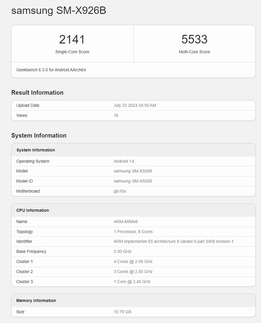 Zuletzt hat ein Leaker betont, dass beide Samsung Flaggschiff-Tablets mit Dimensity 9300+ bestückt sein werden, was aber nur halb wahr sein dürfte. Das Galaxy Tab S10+ wurde doppelt mit dem maximal 3,2 Ghz schnellen Dimensity 9300 in der Benchmark-Datenbank Geekbench entdeckt, beim Ultra-Modell stimmen die Aussagen des Leakers allerdings tatsächlich, wie nun ebenfalls Geekbench enthüllt. Die allwissende Datenbank enthält nun die ersten Specs eines Galaxy Tab S10 Ultra mit der Modellnummer SM-X926B, es handelt sich hierbei also um die globale Version.