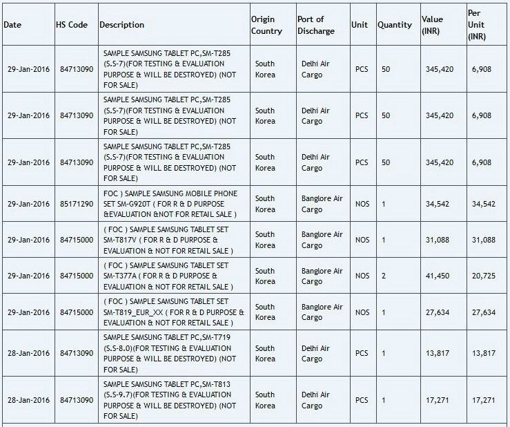 Die nach Indien exportierten Tablet-Computer dienen den Eineinträgen zufolge Evaluierungs- und Testzwecken und werden danach weder verkauft noch an Samsung zurückgesendet. Gemäß den Frachtpapieren verbleiben die Testsamples in Indien und werden nach Abschluss der Arbeiten zerstört. Bisherige Gerüchte gehen davon aus, dass Samsung für einen Refresh der Galaxy Tab S2 Serie auf einen Exynos 7420, 4 GB RAM und einen stärkeren Akku setzen könnte.