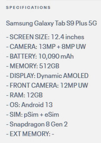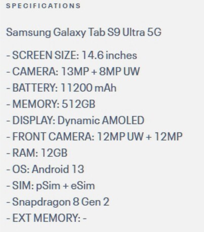 Demnach bleibt das Galaxy Tab S9 Ultra beim 14,6 Zoll AMOLED-Display, beim 11.200 mAh Akku und bei der 13 Megapixel Hauptkamera, die bereits beim Galaxy Tab S8 Ultra (ca. 980 Euro auf Amazon) zum Einsatz gekommen ist, die 6 MP Ultraweitwinkel-Kamera wird allerdings durch eine neue 8 MP Kamera ersetzt. Samsung verbaut wie gehabt zwei 12 MP Frontkameras, die in einer Notch sitzen, sodass Nutzer die Wahl zwischen einem Weitwinkel- und einem Ultraweitwinkel-Objektiv haben. Die 5G-Version des Tablets unterstützt sowohl eine herkömmliche SIM-Karte als auch eine eSIM. Zumindest die im Datenblatt genannte Variante ist mit 12 GB RAM und 512 GB Flash-Speicher ausgestattet.