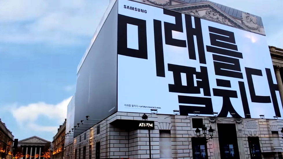 Mit der Billboard-Kampagne wolle Samsung die Schönheit der koreanischen Schrift Hangeul den Menschen auf der ganzen Welt in einer dynamischen und mutigen Weise präsentieren. Die Samsung-Kampagne zeigt Bilder, die sich auf "The Future Unfolds" (Die Zukunft entfaltet sich) übertragen lassen und ein Hinweis auf Samsung kommendes Falt-Handy sein sollen. Der Samsung-Event Galaxy Unpacked 2019 findet am 20. Februar in San Francisco statt.