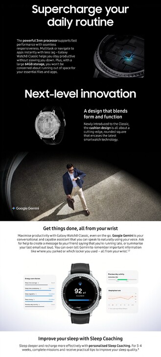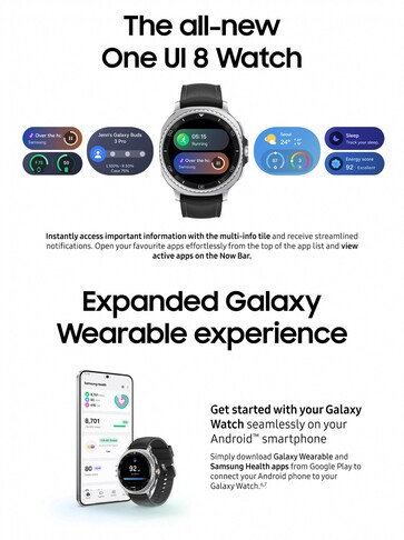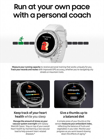 Laut der Promo-Bilder ist das neue Gehäuse 11 Prozent dünner im Vergleich zur Galaxy Watch7, der Exynos W1000 und das 3.000 Nits helle AMOLED-Display werden direkt vom Vorgängermodell übernommen. Viele der Features, welche die Promo-Bilder bewerben, stehen nach dem Update auf One UI 8 Watch auch auf der Galaxy Watch7 zur Verfügung, inklusive Running Coach, Bedtime Guidance und Antioxidantien-Index.