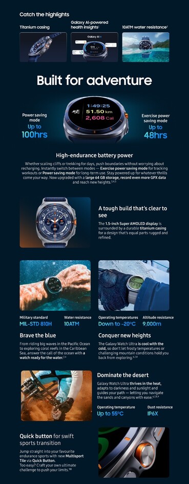Die Galaxy Watch Ultra (2025) soll einen auf 64 GB verdoppelten Speicher erhalten, und wie gehabt für 699 Euro angeboten werden. Abgesehen davon gibt es offenbar keine großen Neuerungen. Im Vergleich zur Galaxy Watch8 und zur Galaxy Watch8 Classic bietet das Topmodell eine Reihe von Upgrades, inklusive bis 10 ATM wasserfestem Titan-Gehäuse, akkuraterem Dual-Band-GPS-Modul und 86 dB lauter Sirene, der größere Akku soll eine Laufzeit von 48 Stunden bei normaler Nutzung ermöglichen.