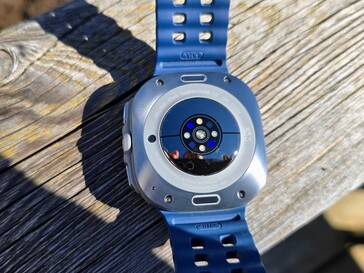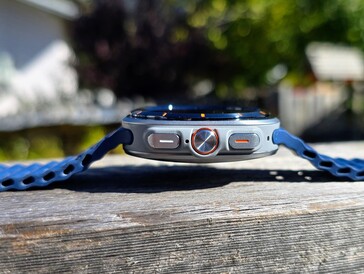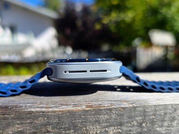 Die Watch Ultra ist die größte Uhr im Samsung-Watch-Lineup. Mit 47 Millimetern fällt sie am breitesten aus- gerade im Vergleich zur Watch8 fällt aber die enorme Dicke auf. Die Wuchtige Erscheinung wird durch das 24 mm breite Armband samt Doppelschließe weiter betont.