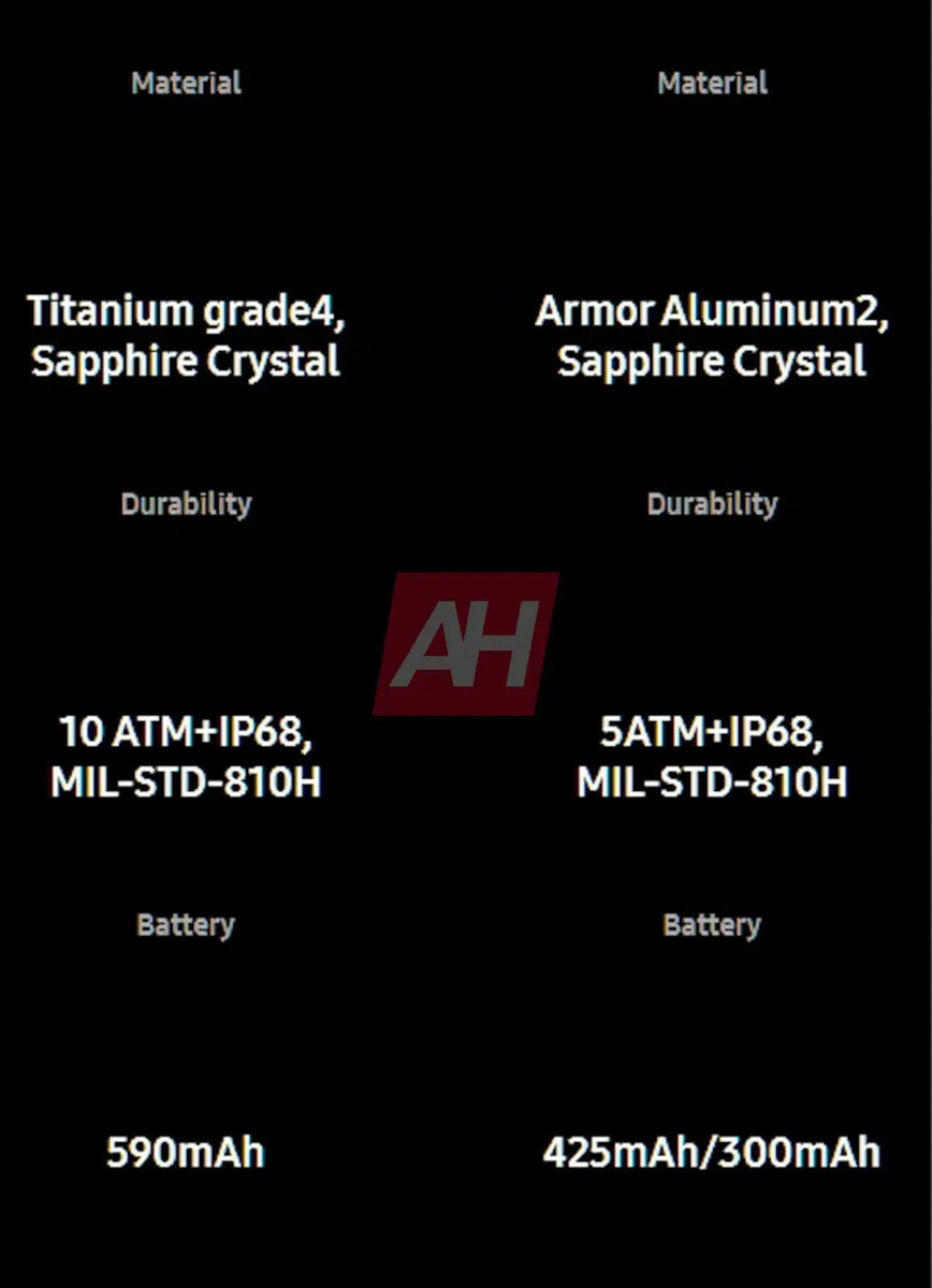 Fangen wir mit der Galaxy Watch7 an, die demnach wieder gewohnt in zwei Größen mit 40 und 44 mm Größe kommen wird. Der Hersteller nutzt bei der Herstellung des Gehäuses Armor Aluminium2 und Sapphire Crystal, was zu einer bis 5 ATM und nach IP68 wasserdichten und gemäß MIL-STD-810H geschützten Smartwatch führt. Seitlich gibt es eine Home- und Zurück-Taste.