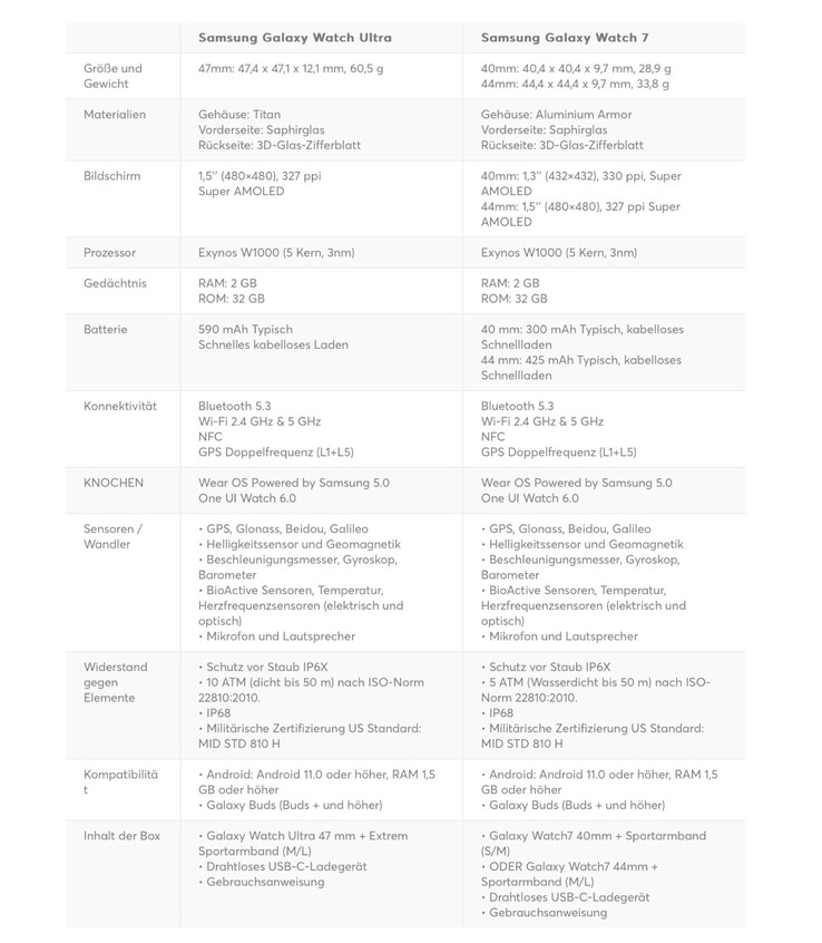 Erstens ein Gehäuse aus Titan statt Aluminium, zweitens einen weitaus größeren 590 mAh Akku, statt der 425 mAh Batterie der 44 mm Galaxy Watch7 bzw. dem 300 mAh Akku des 40 mm Modells, und drittens ein bis 10 ATM statt 5 ATM wasserfestes Gehäuse. Abgesehen von diesen Unterschieden und dem auffälligeren Design des Ultra-Modells besitzen die Smartwatches dieselbe Ausstattung.