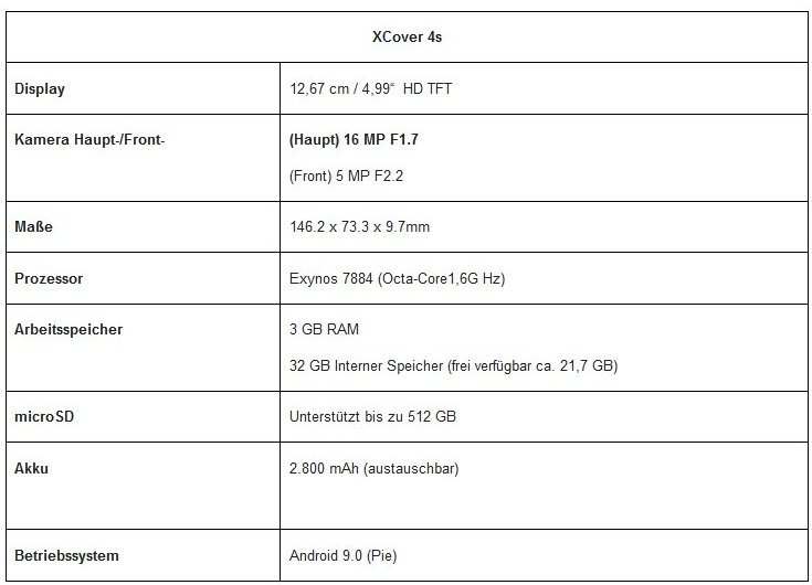 Für zusätzlichen Speicherplatz lassen sich mit dem XCover 4s nun microSD-Speicher bis zu einer Kapazität von 512 GB nutzen, das XCover 4 ist für bis zu 256 GB spezifiziert. Zusätzlich erlaubt das XCover 4s eine Dual-SIM-Nutzung und integriert eine anschlussfreundliche USB Typ-C-Buchse. Das 5-Zoll-Display zeigt weiter 1.280 x 720 Pixel und auch die Akkukapazität bleibt bei 2.800 mAh.