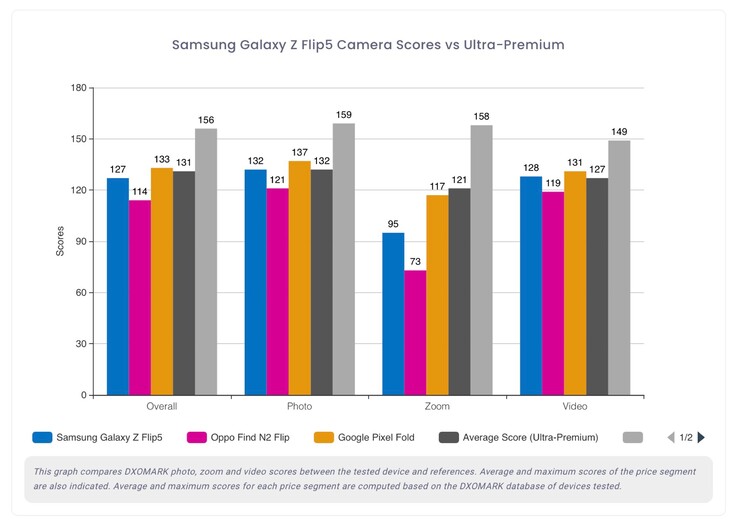 In der Kamera-Analyse von DxOMark schneidet das Galaxy Z Flip5 mit 127 Punkten dennoch 15 Punkte besser ab als sein Vorgänger, und schafft es immerhin auf Platz 44 auf der Bestenliste, gleichauf mit dem Apple iPhone 12 Pro und einen Platz vor dem Google Pixel 6. Diese solide Wertung verdankt das Galaxy Z Flip5 nicht zuletzt Software-Optimierungen, wodurch der Weißabgleich und die Auto-Belichtung akkuratere Ergebnisse liefern als noch beim Galaxy Z Flip4.