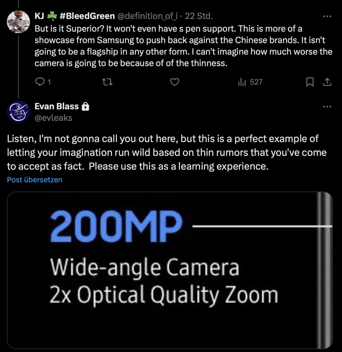 Heute gehen die Hinweise des US-Leakers munter weiter. Als etwas passiv-aggressive Antwort auf den Einwurf eines Kommentators auf X, der zum gestrigen Leak meinte, dass es sich beim Galaxy Z Fold Special Edition wohl kaum um ein Flaggschiff handeln könne, antwortete Blass mit einem Samsung-Screenshot, der einen 200 Megapixel Sensor in der Hauptkamera des Special Edition Foldables nahelegt. (siehe Screenshot unten).