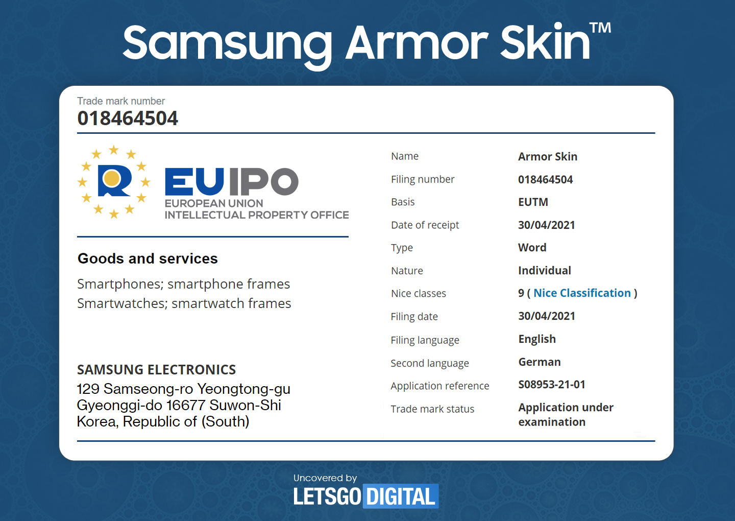 Die aktuell neu entdeckten Warenzeichen "Armor Skin" und "Armor Layer" beziehen sich auf die Kategorien "Smartphones, Smartphone Frames, Smartwatches und Smartwatch frames" und könnten daher sowohl für das Galaxy Z Fold3 und Galaxy Z Flip3 relevant sein als auch für Samsungs neue Smartwatches, vermutlich Galaxy Watch4 und Galaxy Watch Active4 genannt. Zu letzterer hat sich ja gerade auch ein Leaker geäußert und dabei ein robusterers Gehäuse erwähnt, in Bezug auf die neuen Samsung-Foldables könnte "Armor Skin" und "Armor Layer" auf deutlich kratz-resistentere flexible AMOLED-Displays deuten, immerhin sollen sie ja etwa auch mit S-Pen bedienbar sein.