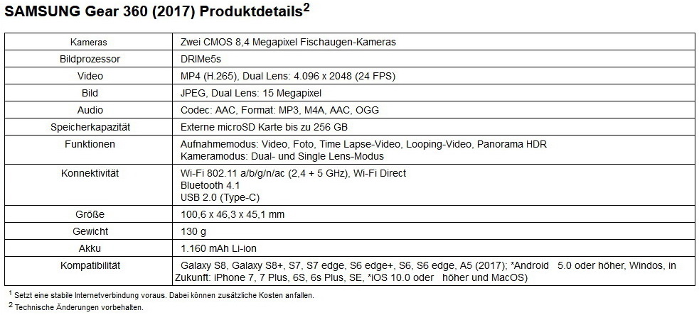 Ab heute ist die neue Rundumkamera Gear 360 (2017) von Samsung im Handel erhältlich. Die 360-Grad-Kamera unterstützt Videoaufnahmen in 4K/UHD-Auflösung und erlaubt es Nutzern, ihre Inhalte in Echtzeit über Social-Media-Kanäle wie Facebook und YouTube mit Freunden und Familie zu teilen. Zudem ist die neue Gear 360 (2017) noch leichter und handlicher als das Vorgängermodell. Samsung nennt für die neue Gear 360 2017 eine unverbindliche Preisempfehlung von rund 250 Euro.
