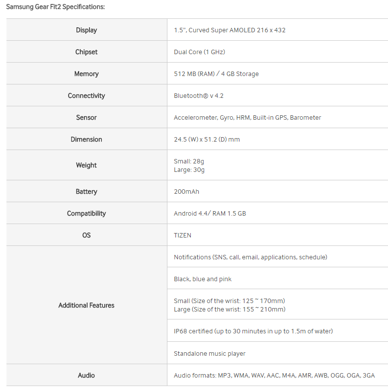 Das Gear Fit 2 ist der Nachfolger des 2014 vorgestellten Gear Fit. Das Armband läuft mit Samsung's Tizen OS und kann sich mit Android Geräten ab Version 4.4 und mindestens 1,5 GB RAM synchronisieren. Das 1,5 Zoll große, gebogene Super AMOLED-Display bietet 216 x 432 Pixel und ist doppelt so breit wie beim Vorgänger. Die Anzeige arbeitet immer vertikal im Hochkant-Modus. Herzfrequenz-, Bewegungs, Gyro-, Höhen- und GPS-Sensoren sind integriert. Das Gear Fit 2 ist nach IP68 wasser- und staubresistent, kann also bis zu 30 Minuten in maximal 1,5 m Wassertiefe überleben.