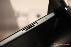 Der Aufklapp-Mechanismus wird über ein massives Gelenk gelöst, das ohne mechanische Stützen auskommt. Die zu kühlenden Komponenten des ATIV Q sitzen in diesem kleinen Gelenk-Arm, ebenso der Lüfter. Beim Öffnen in Notebook-Positionen findet das Display seinen Anschlag über kleine Kunststoff-Haken über der Tastatur. Das Panel findet daher einen sicheren Stand und wippt nicht bei der Touch-Benutzung. Im Tisch-Modus (TFT parallel zur Base) klappt die Anzeige schnell von selbst wieder nach unten, weshalb wir diesen Modus eher für unbenutzbar halten. Das dicke Gelenk lagert in einer Ausbuchtung oberhalb der Tastatur. Eine starke aber nicht sichtbare Feder zieht selbiges nach oben, weshalb das Aufklappen in den Notebook-Modus leichtgängig ist.
