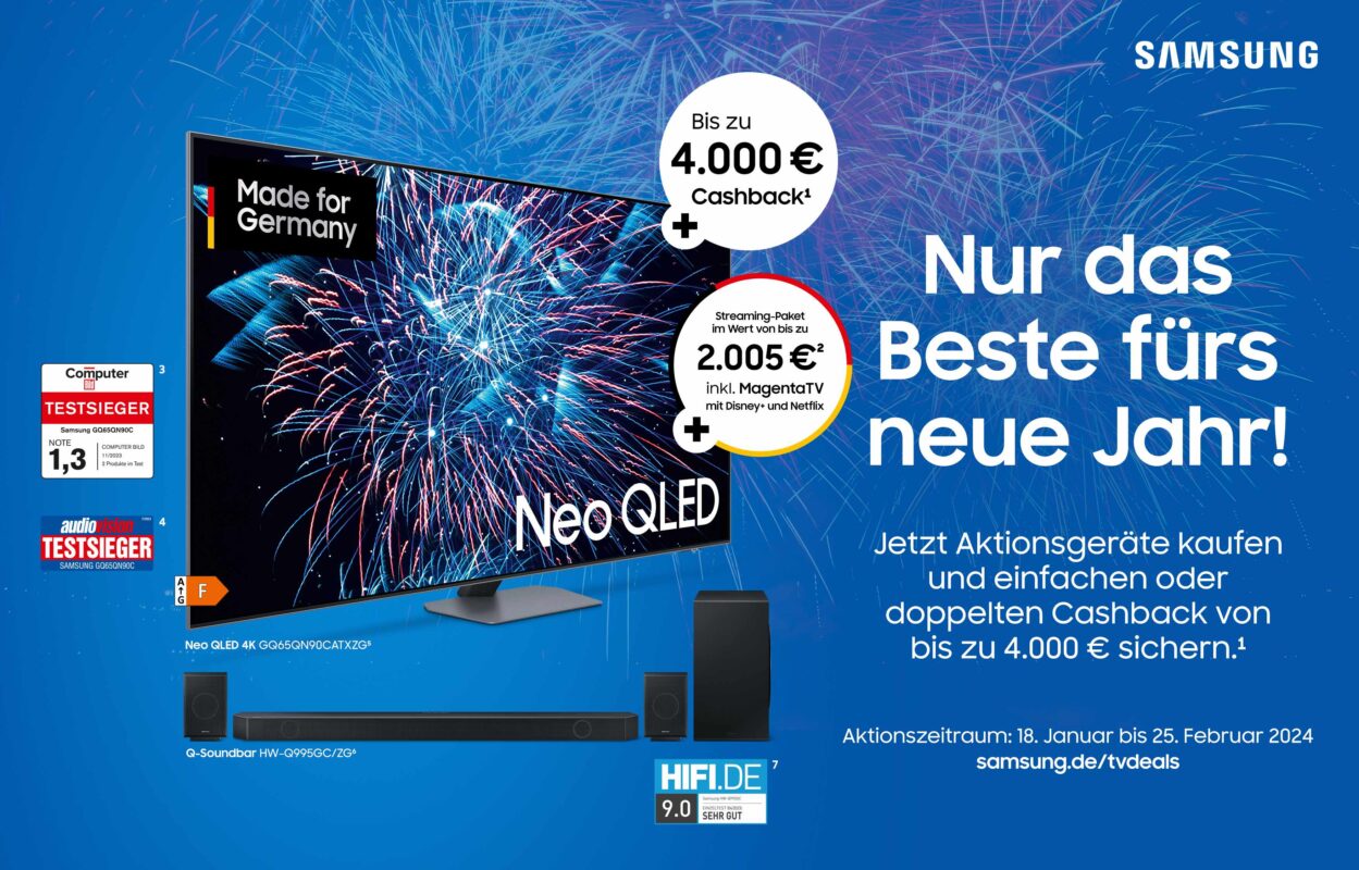 Wichtig ist, dass die Teilnahmebedingungen zwingend eingehalten werden. Dafür muss im Aktionszeitraum vom heutigen 18. Januar 2024 bis zum 25. Februar 2024 eines der auf der Aktionsseite genannten Modelle bei einem der teilnehmenden Händler wie Amazon, MediaMarkt, Saturn oder Cyberport erworben werden. Anschließend muss der Kauf bis zum 10. März 2024 unter samsung.de/tvdeals registriert werden. Nach erfolgreicher Prüfung wird der entsprechende Cashback überwiesen. Wer hingegen im Samsung Online Shop bestellt, bekommt den Cashback direkt vom Kaufpreis abgezogen.