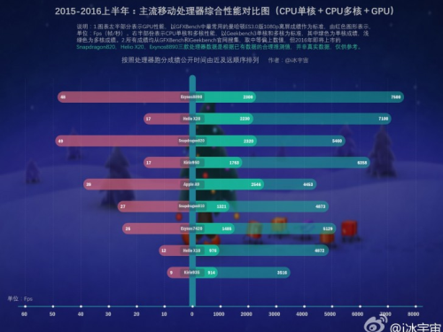 In der Leistungsübersicht der neuen High-End-Chips von mydrivers.com (siehe unten) wurde GFXBench für die GPU-Performance eingesetzt (Fps links auf der x-Achse) und Geekbench 3 für den CPU-Wert (rechts auf der x-Achse). Beim CPU-Wert wird zwischen der Single-Core-Leistung (betontes Türkis) und der Multi-Core-Leistung (transparentes Türkis) unterschieden.