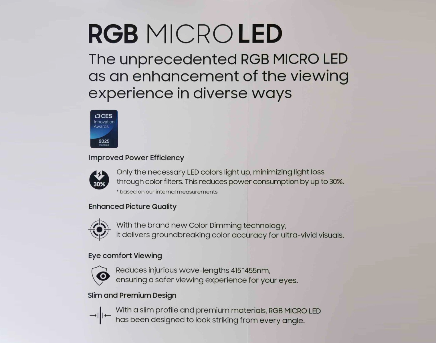 Das reduziert einerseits Blooming-Effekte, soll andererseits aber auch intensivere Farben ermöglichen, da die microLEDs nicht nur Weiß leuchten, sondern auf Wunsch auch Rot, Grün oder Blau, um auf die Farbe des dargestellten Inhalts angepasst zu werden. Da die Farbe der Hintergrundbeleuchtung und des LCD-Panels, das als Farbfilter fungiert, so annähernd übereinstimmen, geht weniger Licht verloren, wodurch der Stromverbrauch bei gleicher Helligkeit um bis zu 30 Prozent reduziert werden soll. Der Prototyp soll den BT.2020-Farbraum zu 90 Prozent darstellen können. Während Samsung noch nicht bestätigt hat, wann oder zu welchem Preis der erste RGB microLED Smart TV auf den Markt kommen wird, sollen die Fernseher teurer als Samsungs 8K Neo QLED TVs angeboten werden.