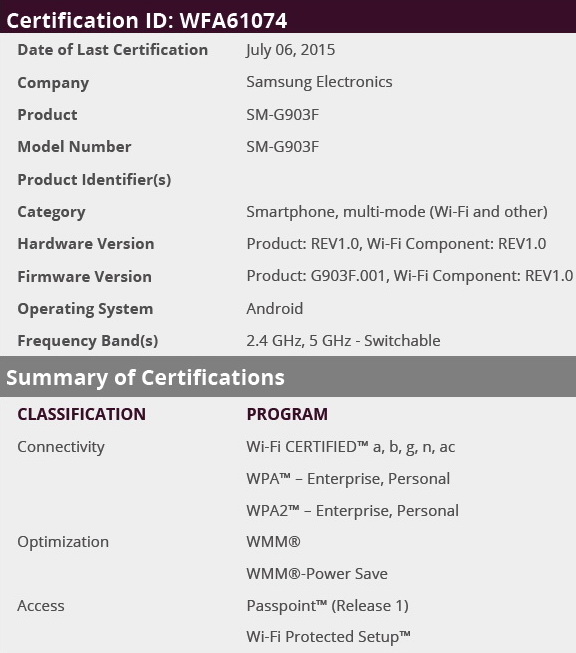 Das Samsung SM-G903F hat von der Wi-Fi Alliance die Zertifizierung für schnelles WLAN 802.11 ac erhalten. Bisher hat Samsung das Modell SM-G903F noch nicht offiziell vorgestellt. Bei den Spekulationen wird aber davon ausgegangen, dass es sich bei dieser Varianten um das kommende Galaxy S5 Neo handeln könnte.