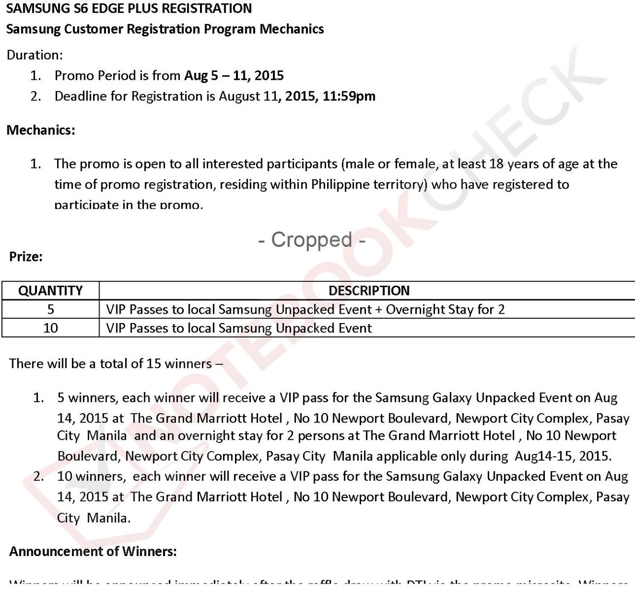 Zudem hat Samsung Philippines auch ein PDF hochgeladen, das die bisherigen Vermutungen bestätigt, dass der Konzern auf dem nun anstehenden Unpacked Event 2015 für das 2. Halbjahr offenbar tatsächlich unter anderem das Galaxy S6 Edge Plus vorstellen wird. Das PDF nennt die Vorgehensweise für eine Promoaktion, die allem Anschein nach im Rahmen der "Samsung S6 Edge Plus Registration" geplant war. Als Preise werden darin insgesamt 15 VIP Pässe für eine lokale Samsung Galaxy Unpacked Event Party am 14. August 2015 genannt, die im Grand Marriott Hotel in Pasay City stattfinden sollte.