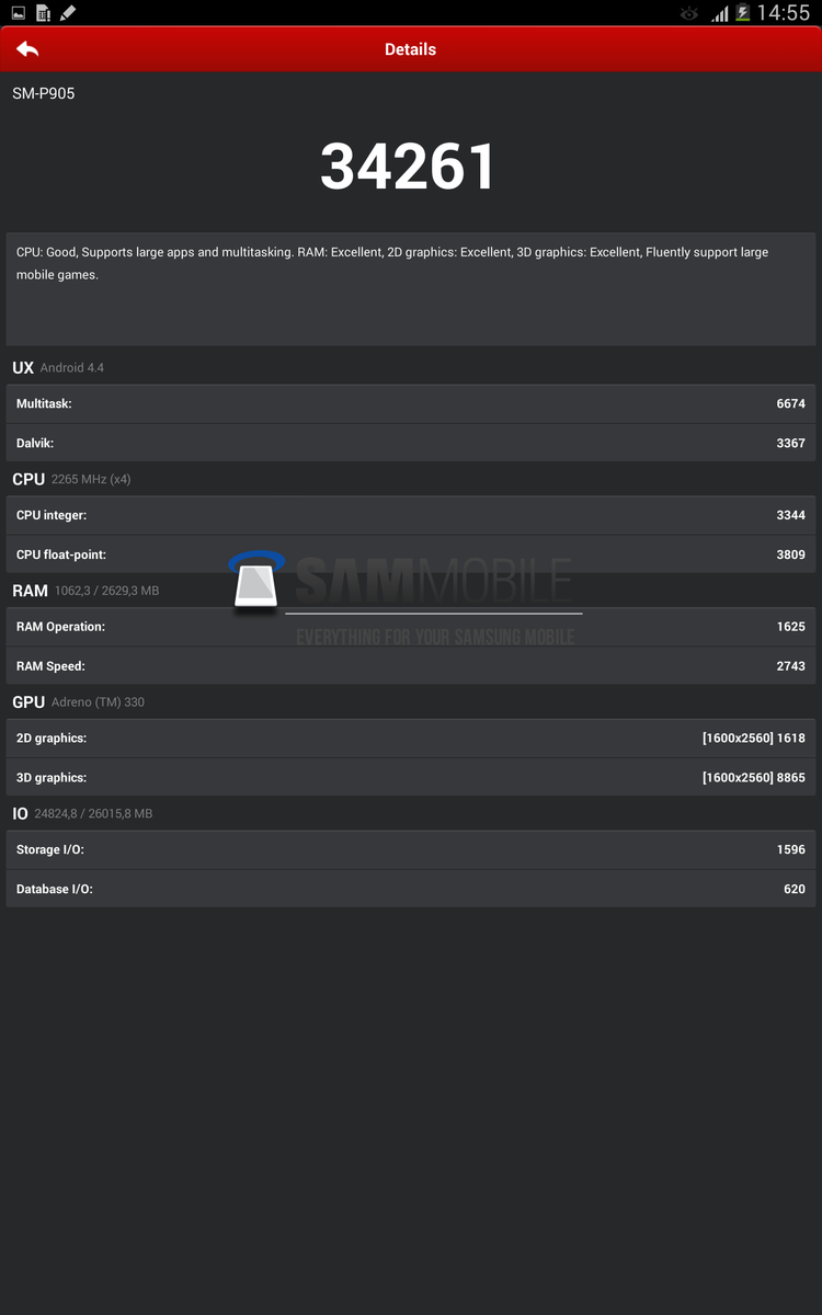 Wie sammobile.com berichtet, hat das Android-Tablet Galaxy Note Pro 12.2 nun den AnTuTu-Benchmark durchlaufen. In diesem Zusammenhang sind auch die technischen Daten bestätigt worden. Demnach hat das bislang größte Galaxy-Note-Tablet einen Bildschirm mit einer Diagonale von 12,2 Zoll und einer Auflösung von 2.560 x 1.600 Pixeln (WQXGA) bei einem 16:10 Bildseitenverhältnis. Für die Leistung ist wie beim Galaxy Note 3 (siehe Test) ein Snapdragon 800 Quadcore-Prozessor zuständig, der auf 2,3 GHz taktet. Dazu gehört eine Adreno-330-Grafikeinheit, die auf 450 MHz getaktet ist. Als Arbeitsspeicher dienen erneut 3 GB.