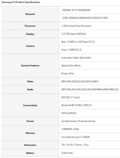 Das Samsung Z3 misst 141,6 x 70 x 7,9 Millimeter, wiegt 137 Gramm und verfügt über einen 2600-mAh-Akku sowie einen microSD-Slot für Flash-Speicherkarten mit einer Kapazität von bis zu 128 GB. Wi-Fi 802.11 b/g/n, Bluetooth 4.0 + LE, USB 2.0, GPS und Glonass runden die Ausstattung des 3G-Smartphones ab. Samsung liefert sein Tizen-Phone mit der My Galaxy App aus, die den Smartphone-Besitzern beispielsweise Angebote von Partnern wie Amazon.in oder Payback anbietet.