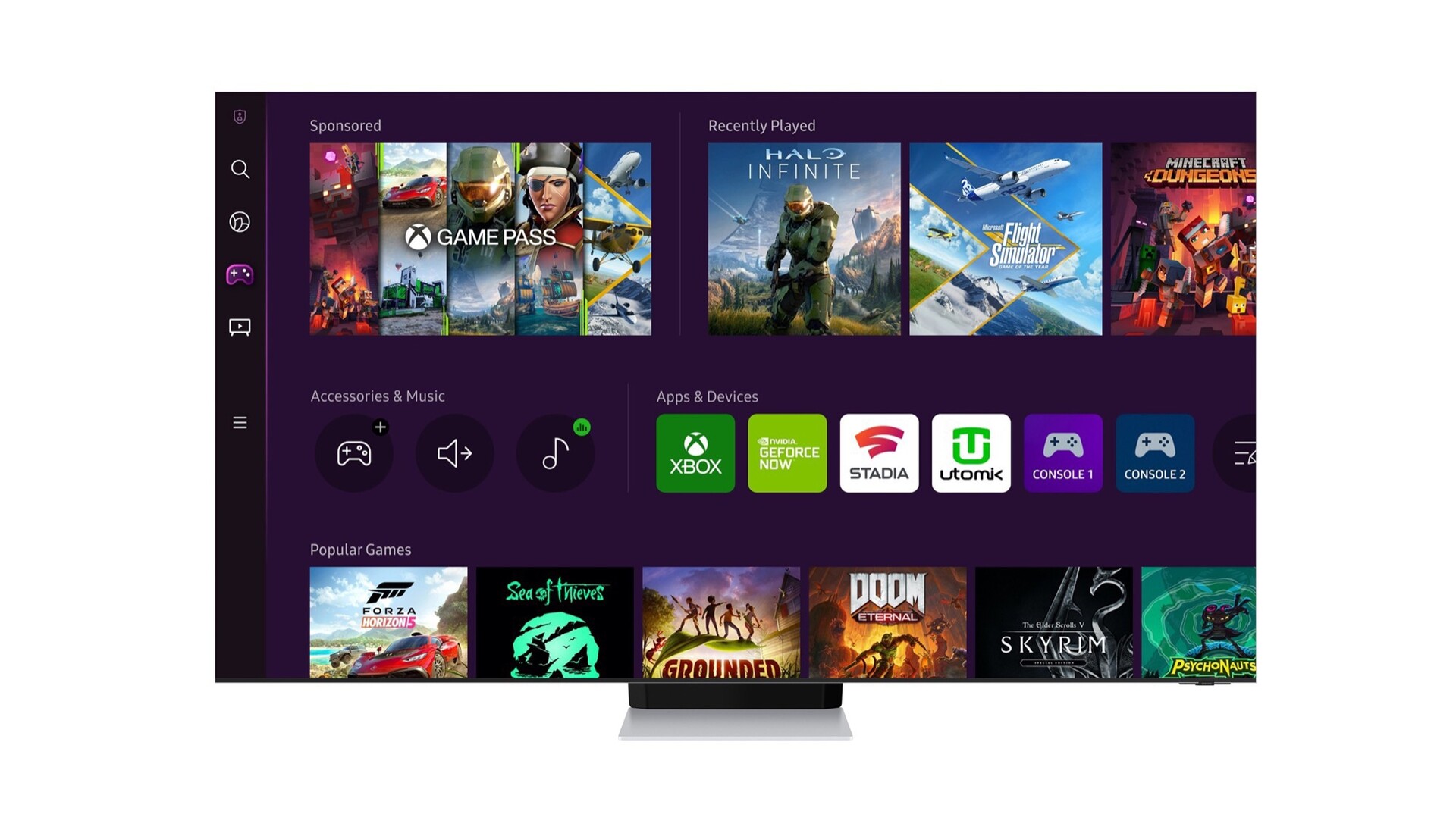 Samsung ermöglicht den Zugriff auf eine Vielzahl von Spiele-Streaming-Diensten, inklusive Xbox Game Pass Ultimate, Google Stadia, Nvidia GeForce Now, Utomik und künftig auch Amazon Luna. Im Gaming-Hub können auch per HDMI an den Fernseher angeschlossene Konsolen und Gaming-PCs ausgewählt werden, während Zubehör wie Gamepads und Bluetooth-Kopfhörer direkt von der Startseite aus verwaltet werden können.