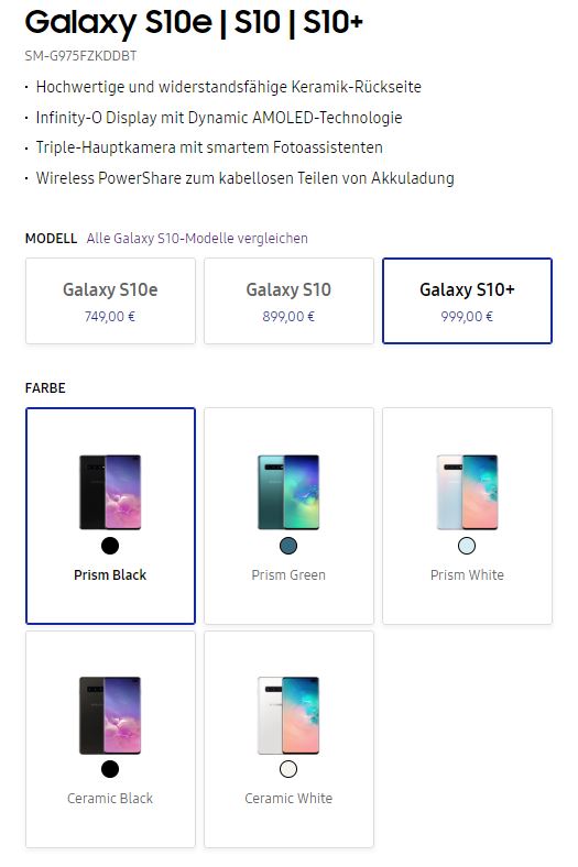 Wer im Februar oder März in den deutschen oder österreichischen Online-Shop von Samsung schaute, bekam dort nur die beiden Ceramic White- und Black-Varianten des Galaxy S10+ zu Gesicht - Aussagen des Vertriebs zufolge, weil man uns "von der Qualität der Keramik-Version überzeugen wolle". Zumindest offiziell waren die deutlich günstigeren Prism-Varianten in Grün, Schwarz und Weiß nicht zu haben, auch wenn sie natürlich bei dem einen oder anderen Händler dennoch gelistet waren.