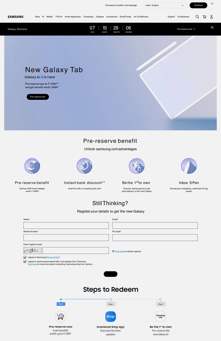Samsung Indien erlaubt es Kunden, zum Preis von 1.000 INR (ca. 11 Euro) eine Reservierung für eines der neuen Tablets zu platzieren, um im Gegenzug ein 45 Watt USB-C-Ladegerät kostenlos zu erhalten. Diese Reservierungen können bis zum 25. September platziert werden. Laut früherer Gerüchte wird die Galaxy Tab S10-Serie am 26. September offiziell vorgestellt, Samsung bekräftigt damit also die bisherigen Gerüchte zum bevorstehenden Launch der Flaggschiff-Tablets. Die Teaser-Webseite bestätigt darüber hinaus, dass der S Pen mitgeliefert wird, wie dies schon beim Galaxy Tab S9 Ultra der Fall war.