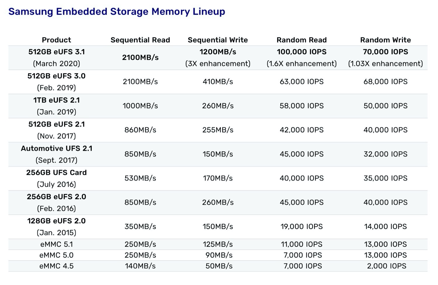 Dafür wurde die Geschwindigkeit beim Lesen sehr kleiner Daten (random) von 63.000 IOPS auf 100.000 IOPS erhöht, wodurch ein Smartphone spürbar schneller reagieren könnte. Beim Schreiben fällt dieser Unterschied deutlich geringer aus – UFS 3.0 konnte hier 68.000 IOPS erreichen, UFS 3.1 schafft immerhin 70.000 IOPS. Seit Samsung die Produktion seiner UFS 2.0-Chips im Januar 2015 gestartet hat ist der Fortschritt aber gigantisch – von 250 MB/s Lesegeschwindigkeit auf 2.100 MB/s, von 11.000 IOPS auf 100.000 IOPS.