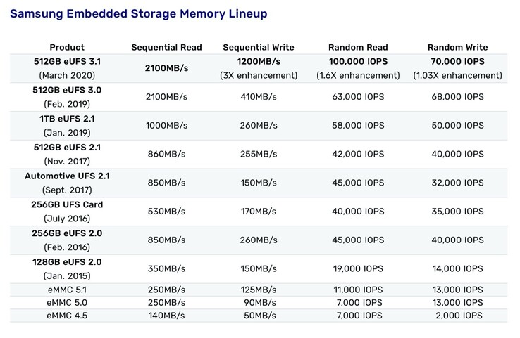 In der Pressemeldung verspricht Samsung, die Performance-Grenzen von Smartphones mit dem neuen UFS 3.1-Speicher erweitert zu haben. Tatsächlich ist die sequentielle Schreibgeschwindigkeit mit 1.200 MB/s deutlich schneller als noch bei UFS 3.0, wo diese bei "nur" 410 MB/s lag.