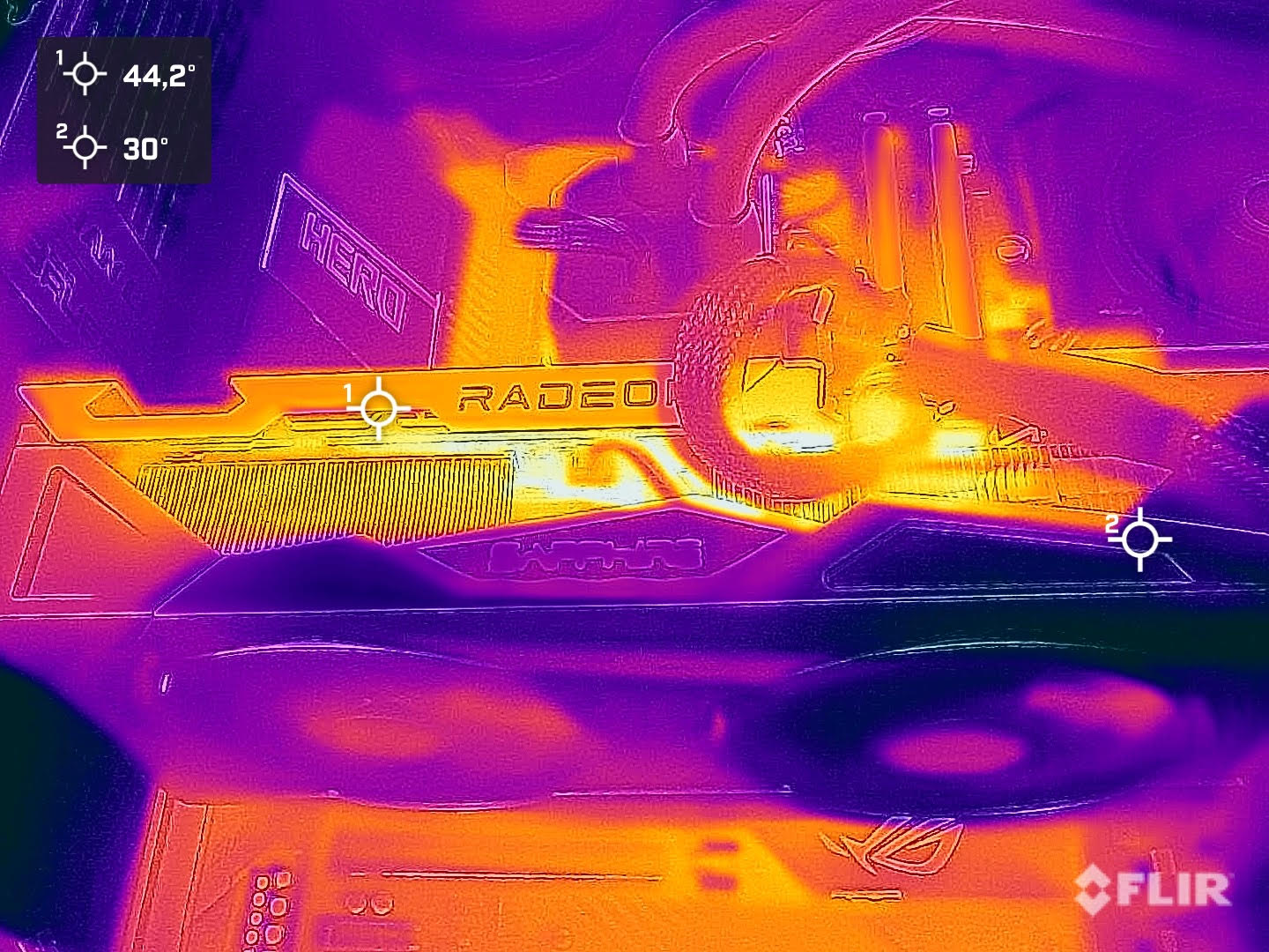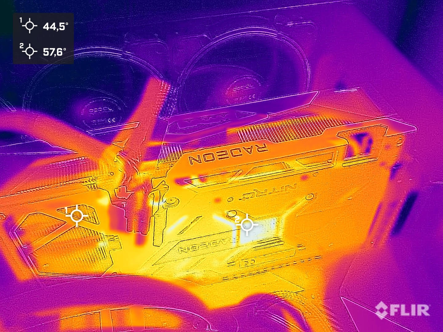 Im Test zeigte sich, dass das Kühldesign der Sapphire Nitro+ Radeon RX 6650 XT durchaus sehr gut funktioniert. Die GPU-Temperatur betrug beim Stresstest nur 69 °C. Dabei rotierten die beiden Axiallüfter mit lediglich 1700 Umdrehungen pro Minute. Damit war die Grafikkarte unter Last nicht aus dem geschlossenen Gehäuse hörbar. Zudem gibt es bei der Sapphire Nitro+ Radeon RX 6650 XT einen Fan-Stop-Mode.