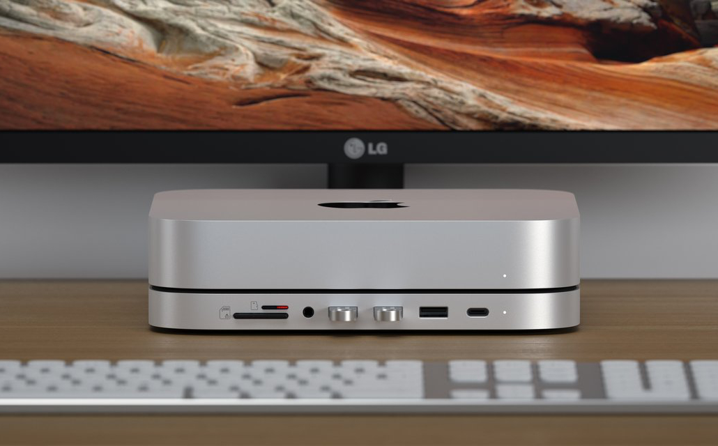 An eben diese Kunden richtet sich der Satechi Stand & Hub, der einfach unter den Mac Mini gestellt werden kann, sodass keine zusätzliche Stellfläche am Schreibtisch benötigt wird. Sobald der Hub mit einem USB-C-Kabel an einen Mac Mini aus 2018 oder 2020 angeschlossen ist kann man die Anschlüsse auf der Vorderseite nutzen, inklusive dreimal USB-A (5 Gbit/s), einmal USB-C (5 Gbit/s), einem Kopfhöreranschluss, einem SD-Kartenleser und einem microSD-Kartenleser.