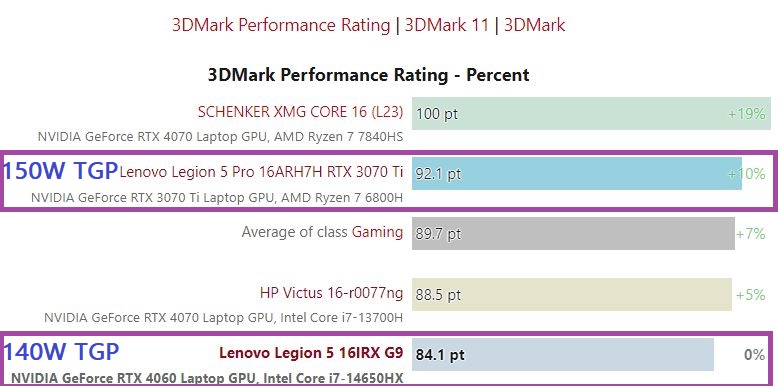 Die RTX 3070 Ti im HP Omen 16 (2022) mit AMD-CPU verfügt über die volle 150W-TGP, wie uns der User Sven0816 mitteilte. In synthetischen 3DMark-Benchmarks schneidet sie um 10 % besser ab als eine voll ausgefahrene RTX 4060, während unser Spiele-Performance-Rating mit Lenovo Legion Laptops, die beide genannten Grafikchips voll ausfahren, ein gegenteiliges Bild zeichnet, wie folgende Grafiken nahe legen. Allerdings sieht es bei anderen Spielen wieder um 5 bis 15 % besser für die RTX 3070 Ti aus, etwa bei Cyberpunk 2077 1.6, God of War, Star Wars Jedi Survivor, Diablo 4 und Baldurs Gate 3.