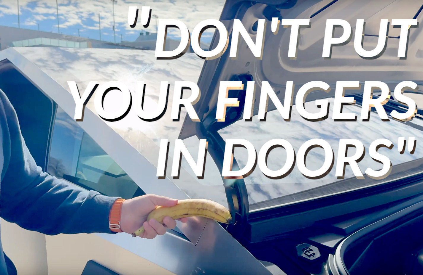 Da die Türen manuell geschlossen werden, haben alle drei Fahrzeuge keine Einklemmsensoren in dem Bereich, aber die ungewöhnlich scharfen Kanten der Karosserieverkleidung des Cybertrucks machen das Einklemmen von Fingern besonders gefährlich, wie die sauber geschnittenen Hotdogs zeigen. Der Rivian R1T hingegen hat abgerundete Kanten sowohl an der Tür als auch an der Karosserie, was ein versehentliches Hineingreifen der Finger etwas weniger traumatisch macht.