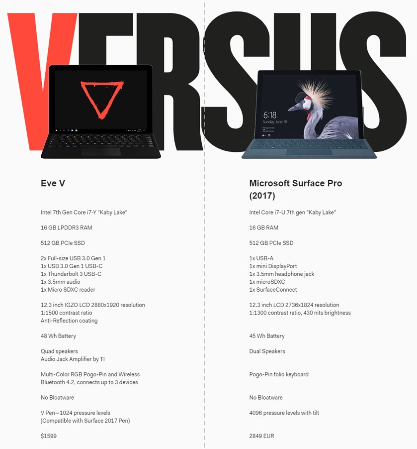 Das Eve V ist in zwei unterschiedlichen Grundausstattungsvarianten verfügbar. Die Einstiegsvariante arbeitet mit einem Intel Core i5-7Y54, 16 GB LPDDR3-RAM und einer 512 GB großen SSD. Der 12,3 Zoll große IGZO-Touchscreen bietet eine Auflösung von 2.880 x 1.920 Pixeln. Schenker bietet dieses Eve V-Modell zu einem Preis von rund 1,550 Euro an. Die stärkere Version des Eve V setzt auf einen Intel Core i7-7Y75.