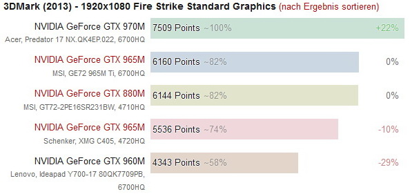 Schenker verspricht sich von der neuen Nvidia GeForce GTX 965M bei der Gaming-Performance im Vergleich zur Nvidia GTX 960M eine Leistungssteigerung von bis zu 40 Prozent. Laut den Ergebnissen aus unseren ersten Tests mit der neuen GPU-Revision der GeForce GTX 965M ergibt sich zur bisherigen 965M ein durchschnittlicher Leistungsgewinn von rund 13 Prozent. Die GTX 960M wird mit fast 30 Prozent deutlich abgehängt.