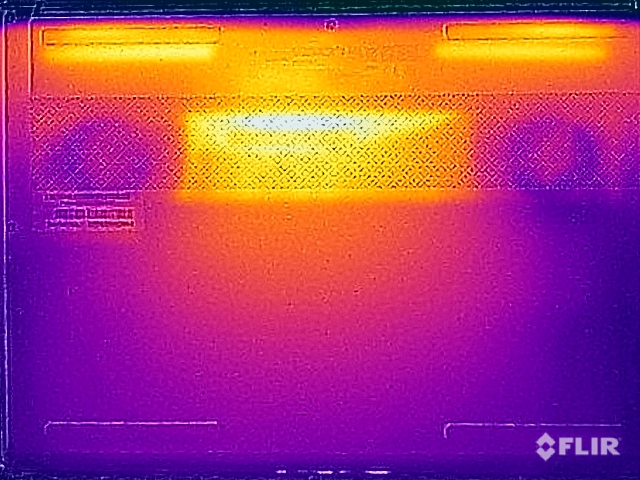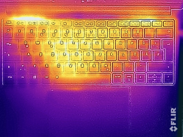 Bei den Oberflächentemperaturen sehen wir ebenfalls große Ähnlichkeit zum Vorgänger. Im Leerlauf und bei wenig anspruchsvollen Aufgaben erwärmt sich das Gehäuse nur minimal, beim Spielen und bei hoher kombinierter Belastung wird der mittlere obere Tastaturbereich mit fast 50 °C sehr warm und auch auf der Unterseite messen wir im mittleren Bereich mehr als 50 °C. In diesen Situationen sollte man das Gerät also nicht auf den Oberschenkeln abstellen. Die iGPU-Version bleibt mit maximal 45 °C an den Hotspots unter Last deutlich kühler.