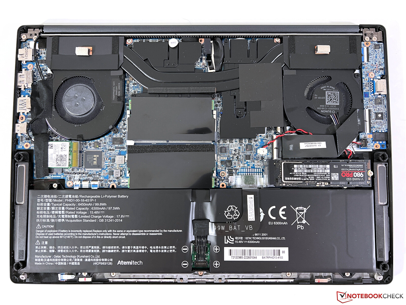 Die untere Abdeckung lässt sich leicht entfernen und im Inneren erkennt man sofort den neuen 99-Wh-Akku, der zudem einige Veränderungen beim Mainboard und den Lautsprechern erfordert. Daher kann der neue Akku auch nicht in bestehende Vision-14-Modelle eingebaut werden. Wer sich für den großen Akku entscheidet, muss zudem auf den zweiten M.2-2280-Steckplatz verzichten. Der Arbeitsspeicher und das WLAN-Modul sind nach wie vor austauschbar.