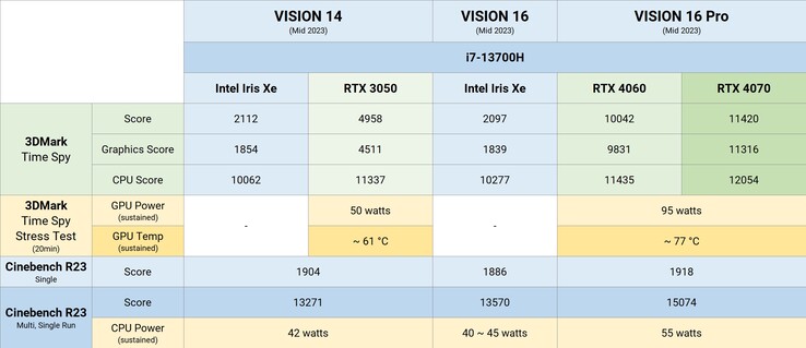 Das Schenker Vision 16 Pro wird mit einem Gewicht von 1,6 Kilogramm als leichtestes Notebook dieser Leistungsklasse beworben. Dazu greift das Gerät auf einen Intel Core i7-13700H und im Topmodell auf eine Nvidia GeForce RTX 4070 Laptop-GPU zurück, die mit einer TGP von 70 Watt plus 25 Watt Dynamic Boost betrieben wird.