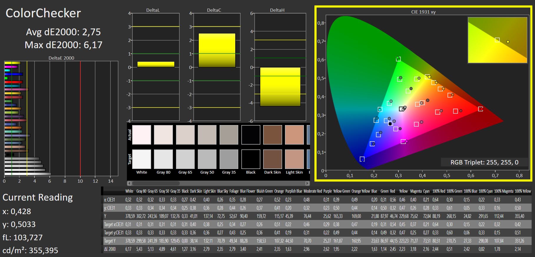 | Colorchecker dE 2000 max. * | 5.51 | 9.54 -73% | 8.92 -62% | 3.63 34% | 4.88 11% | 3.03 45% |